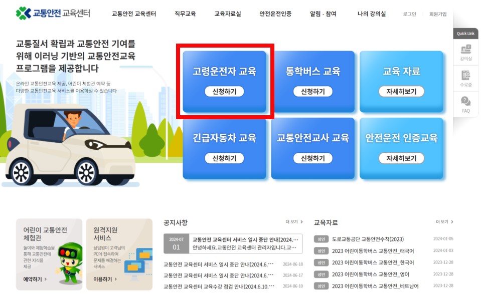 또한 75세 이상인 경우에는 적성검사 전에 고령자 교통안전교육을 받아야 하는데요, 교통안전 교육센터 홈페이지에서 온라인으로 받으실 수 있습니다.