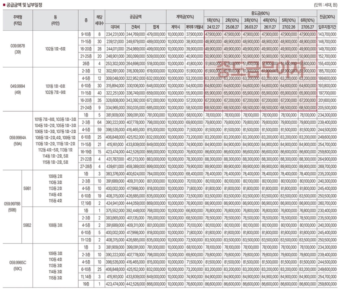 이번 분양 일정에서는 특별공급 263세대, 일반공급 270세대를 분양합니다. 공급가는 평형타입과 층수에 따라 다르며 계약금(10%), 중도금(6회 60%), 잔금(30%)으로 구성되며 일부 평형타입은 중도금 무이자가 적용됩니다.