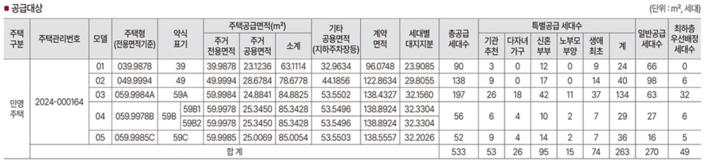 평형 타입별 분양 물량(특별공급, 일반공급)은 아래 표를 참고해 주세요.