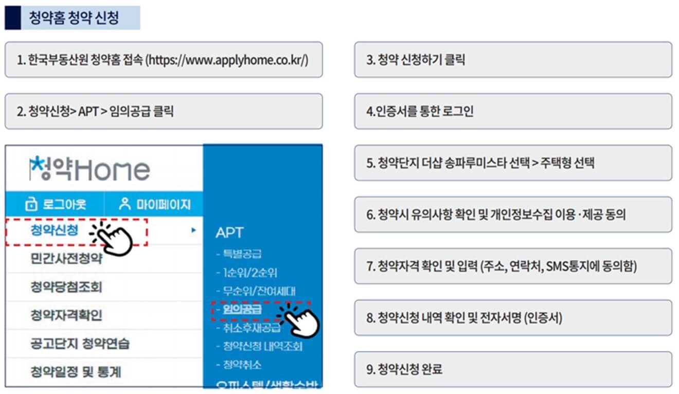 청약을 위해서는 청약통장 가입은행 및 취급은행에 인터넷 뱅킹 가입과 공동인증서를 미리 발급받으시기 바랍니다. 지정된 청약신청일에 인터넷 청약홈에 금융인증서로 인증 후 로그인하셔서 청약하시면 됩니다.