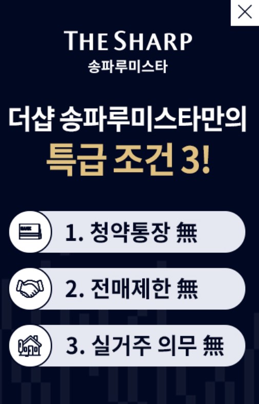 더샵 송파루미스타가 들어서는 서울 송파구는 투기과열지구지만, 이번 청약은 무순위 잔여세대로 청약 시에는 투기과열지구 청약조건에 해당되지 않습니다. 하지만 당첨 이후에는 투기과열지구의 제한 사항을 적용받습니다.