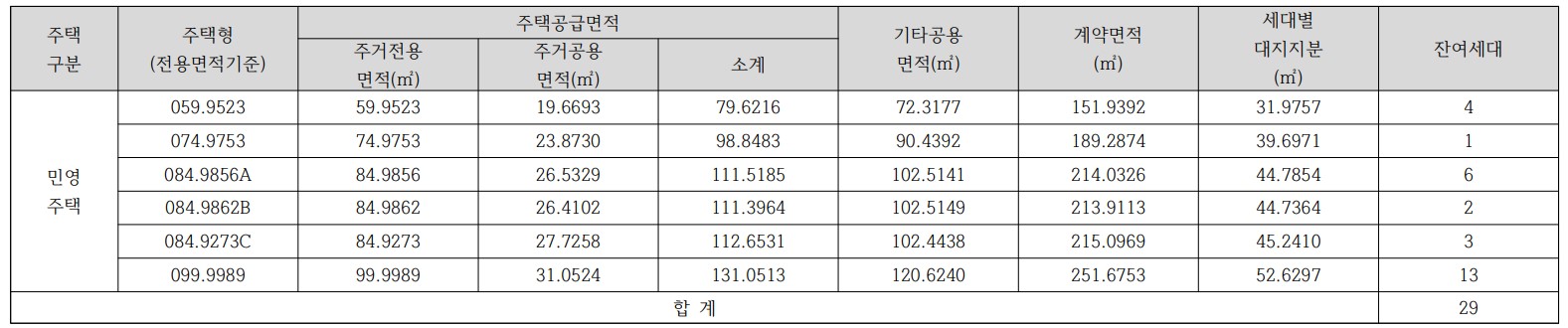 이번 무순위 청약 분양은 총 29세대로, 59타입 4세대, 74타입 1세대, 84타입 11세대 99타입 13세대입니다.