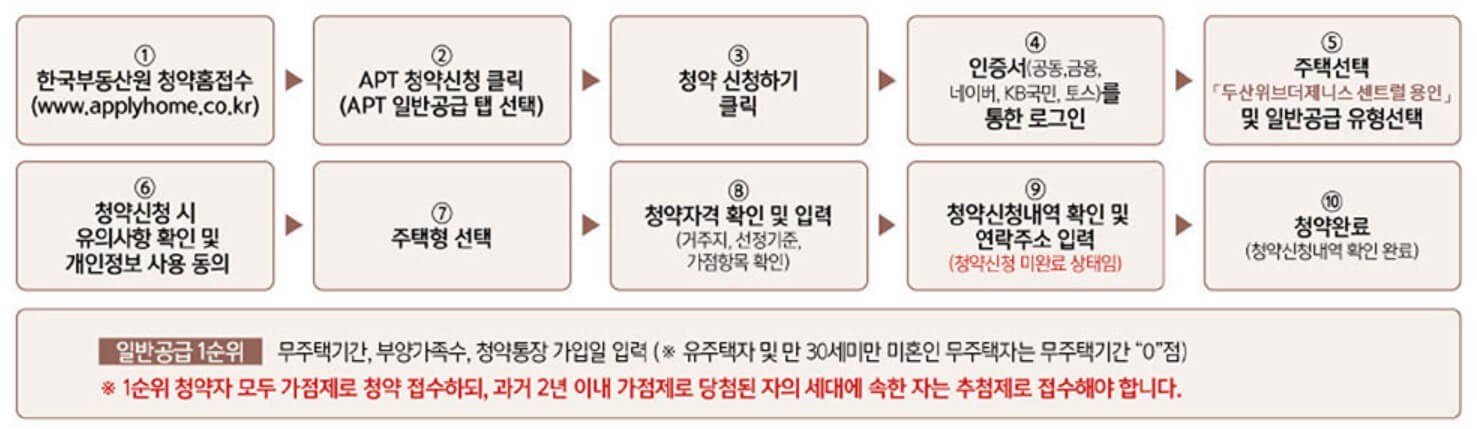 두산 위브더제니스 센트럴용인은 비투기과열지구, 비청약과열지구에 지어지는 것으로 19세 이상이라면 유주택자나 당첨사실이 있어도 청약이 가능합니다. 일반공급 1순위는 3월 13일(수)에 청약이 시작되며 당첨자는 3월 21일(목)에 발표됩니다.