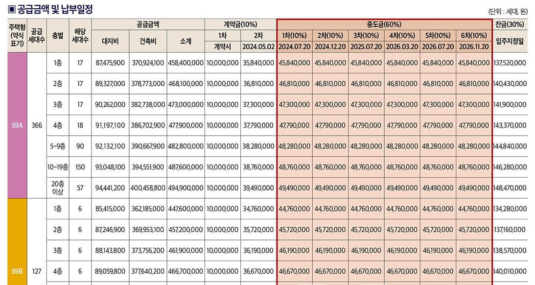 ● 59B 타입 : 4억 4760만원 ~ 4억 8340만원