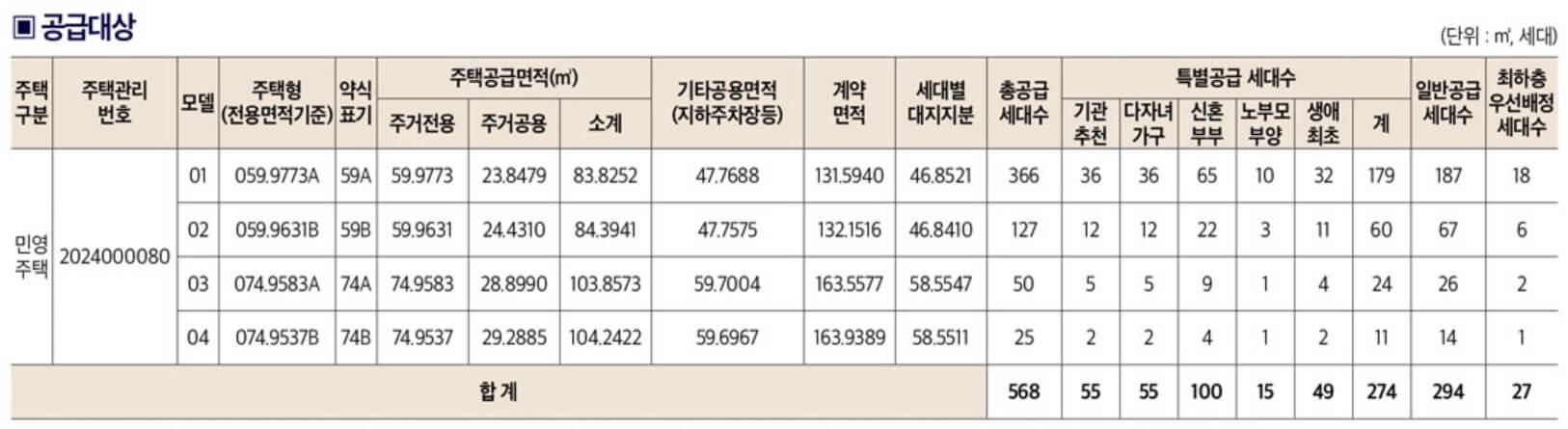 두산 위브더제니스 센트럴용인은 총 568세대로 특별공급 274세대, 일반공급 294세대입니다. 일반공급은 59A타입 187세대, 59B타입 60세대, 74A타입 24세대, 74B타입 11세대로 구성되어 있습니다.