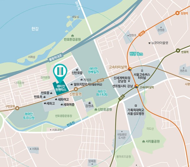 - 교통 - 9호선 신반포역, 3,7,9호선 고속터미널역, 경부고속도로, 올림픽도로 인접