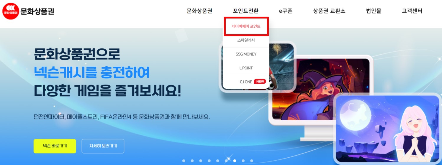 문화상품권 네이버페이로 전환은 문화상품권 홈페이지에서 가능합니다. 홈페이지 상단 메뉴 중 포인트 전환에서 네이버페이 포인트를 선택합니다.