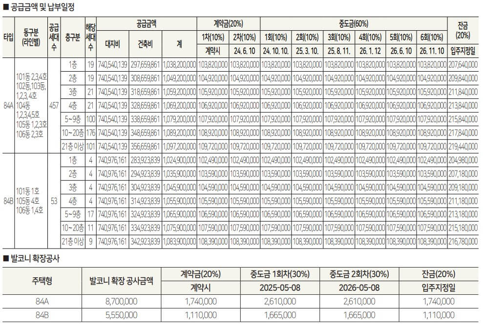 공급금액은 10억 2490만원 ~ 10억 9720만원으로 구성되어 있으며, 층수와 타입에 따라 조금씩 다릅니다. 계약금을 1차, 2차로 나눠서 납부하는데요, 6월까지 2억이 필요합니다. 발코니 확장비는 84A는 870만원, 84B는 555만원입니다.