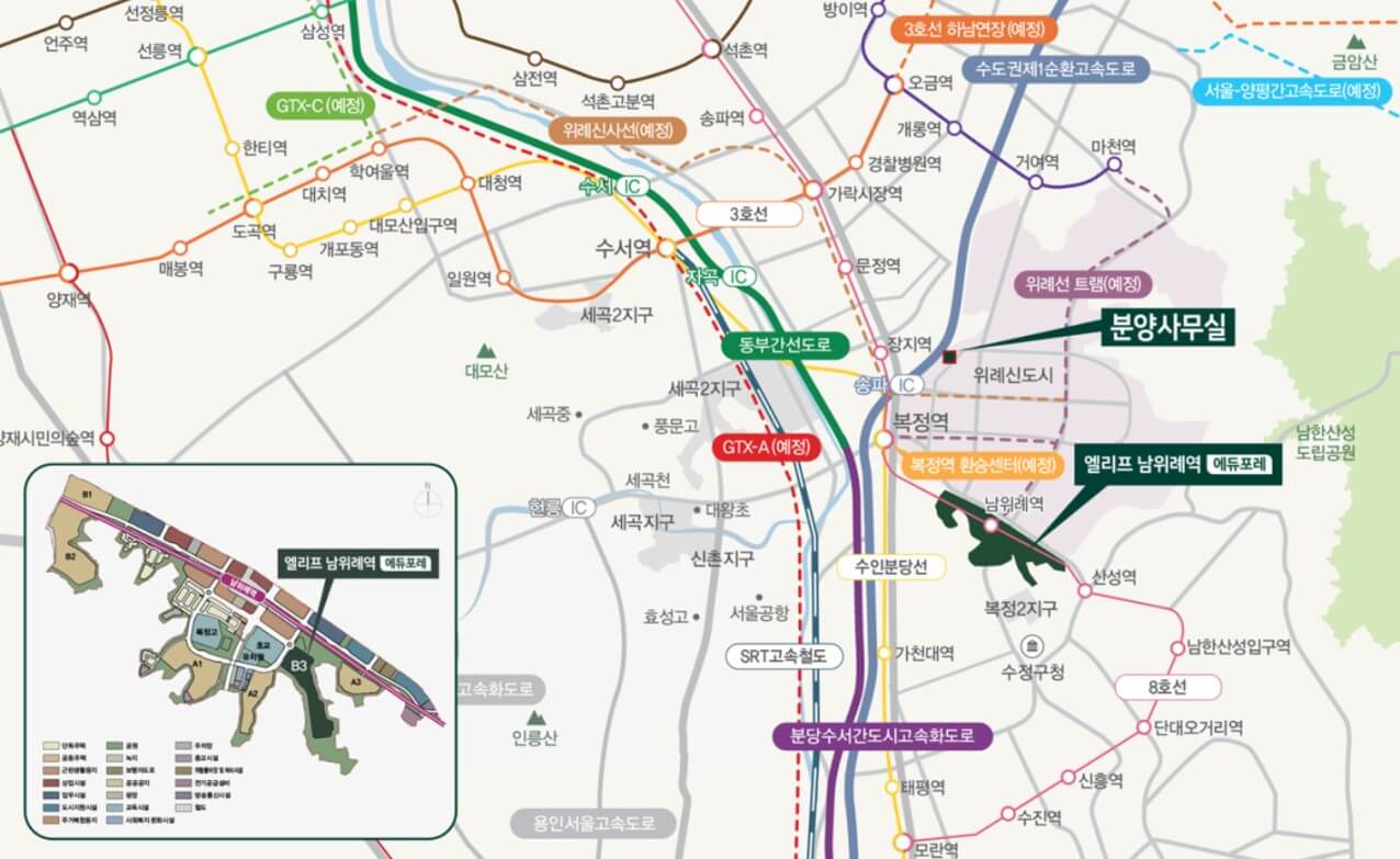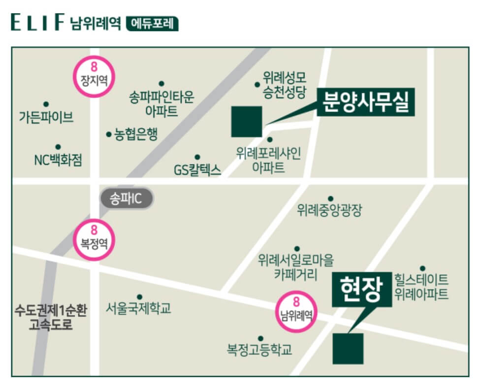 엘리프 남위례역 에듀포레는 경기도 성남시 복정동 남위례역에 위치합니다. 이곳은 위례신도시, 송파구 문정동 강남구 세곡동과 인접하여, 생활권을 공유할 수 있는 곳입니다.
