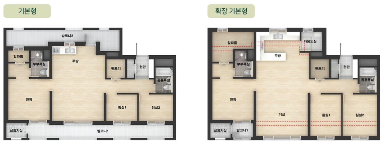 엘리프 남위례역 에듀포레의 평형타입은 84A, 84B 두 가지 타입입니다. 84A는 4Bay로 구성되어 거실과 침실 3개가 나란히 있는 스타일입니다. 84B는 ㄱ자 스타일로 구성되어 거실과 주방 일자형 스타일입니다.