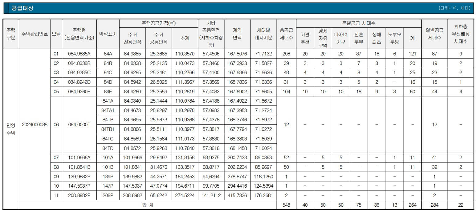 단지마다 세대수와 일반고급 수량이 조금씩 상이하며, 84타입 ~ 208타입, 테라스형 등 중대형 평형 위주로 구성되어 있습니다.