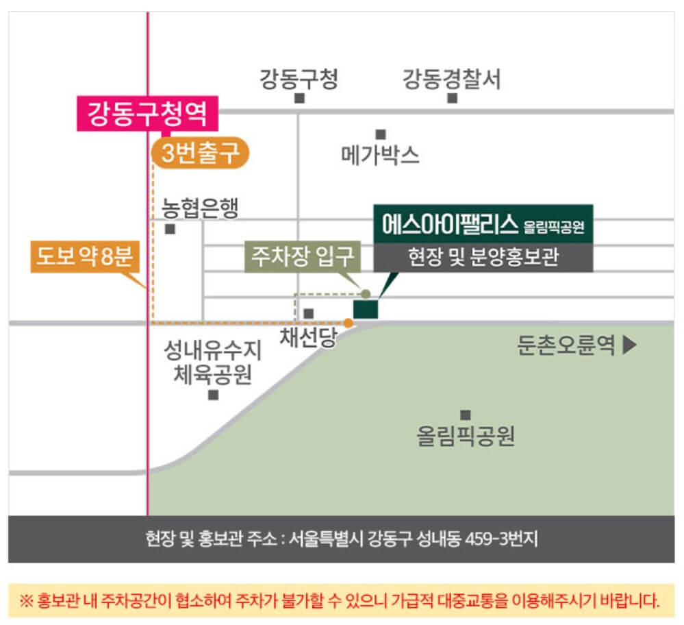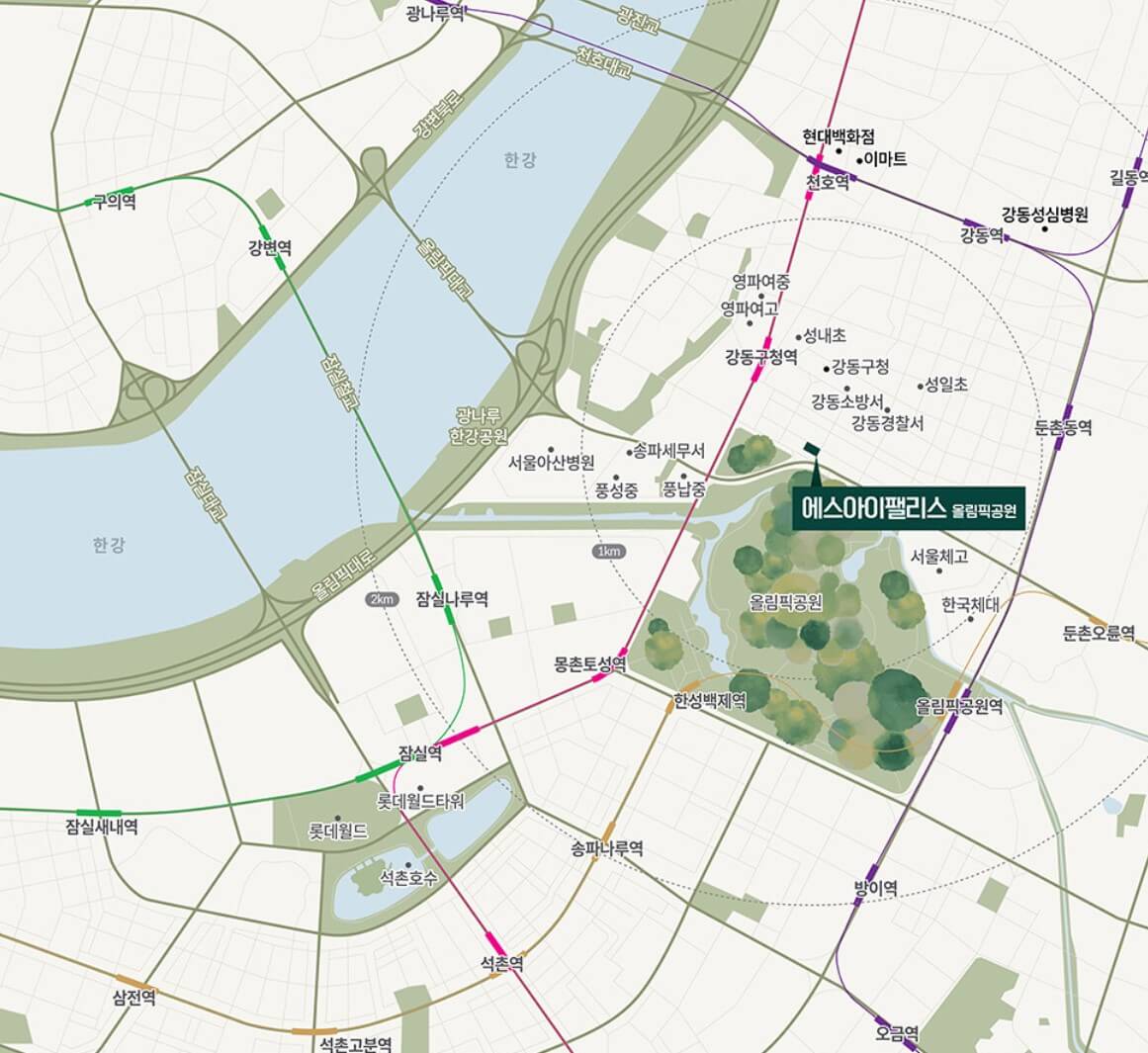 최근 강동구를 포함하여 강남4구로 표현하는데요, 특히나 에스아이팰리스는 송파구와 바로 인접하고 있습니다. 강동구이므로 비규제지역이며 강남 특히 송파의 이점을 모두 이용할 수 있습니다.