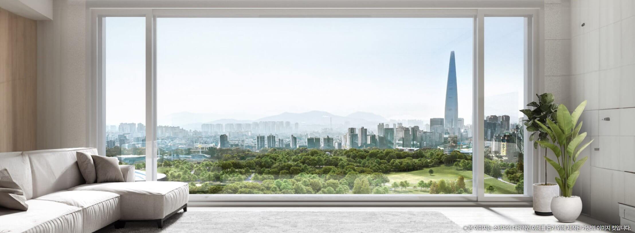 특히 길 건너편의 올림픽공원을 바라보고 있는 거실의 전망과 사철 올림픽 공원을 이용할 수 있는 장점이 있습니다. 또한 잠실과 롯데월드, 롯데백화점, 롯데타워 등의 쇼핑 오락시설과 인근의 아산병원이 가까운 거리에 있어 편의를 제공합니다.