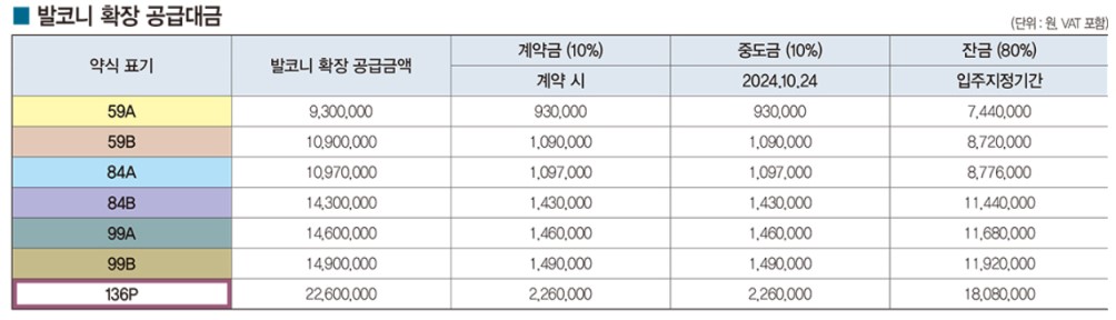 공급금액은 발코니 확장 불포함 금액으로 면적과 타입, 층수에 따라 다르게 구성되어 있습니다.