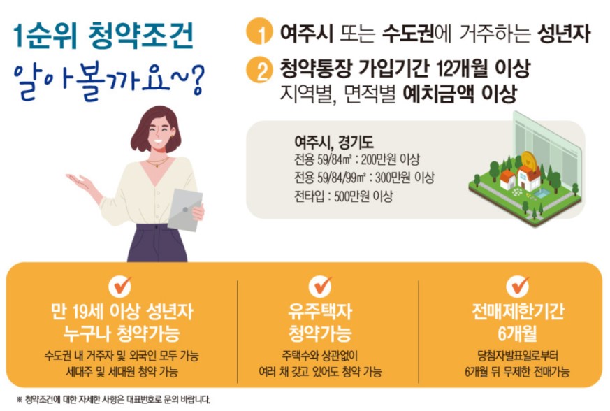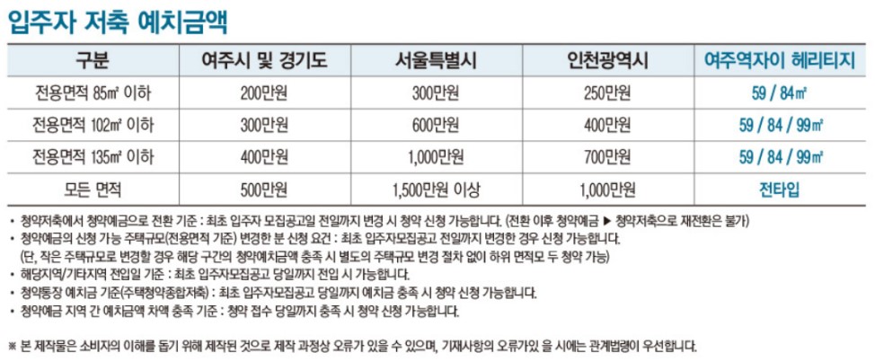 여주역자이 헤리티지 일반공급의 1순위 청약 조건은 여주시 또는 수도권에 거주하는 성년으로 청약통장 가입기간 12개월 이상으로 지역별, 면적별 예치금액 이상이면 가능합니다.