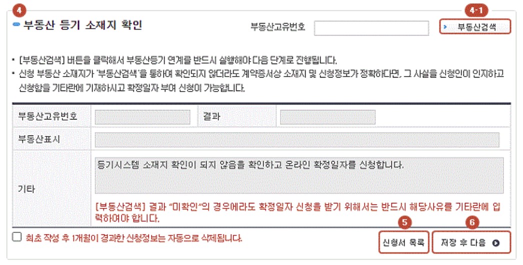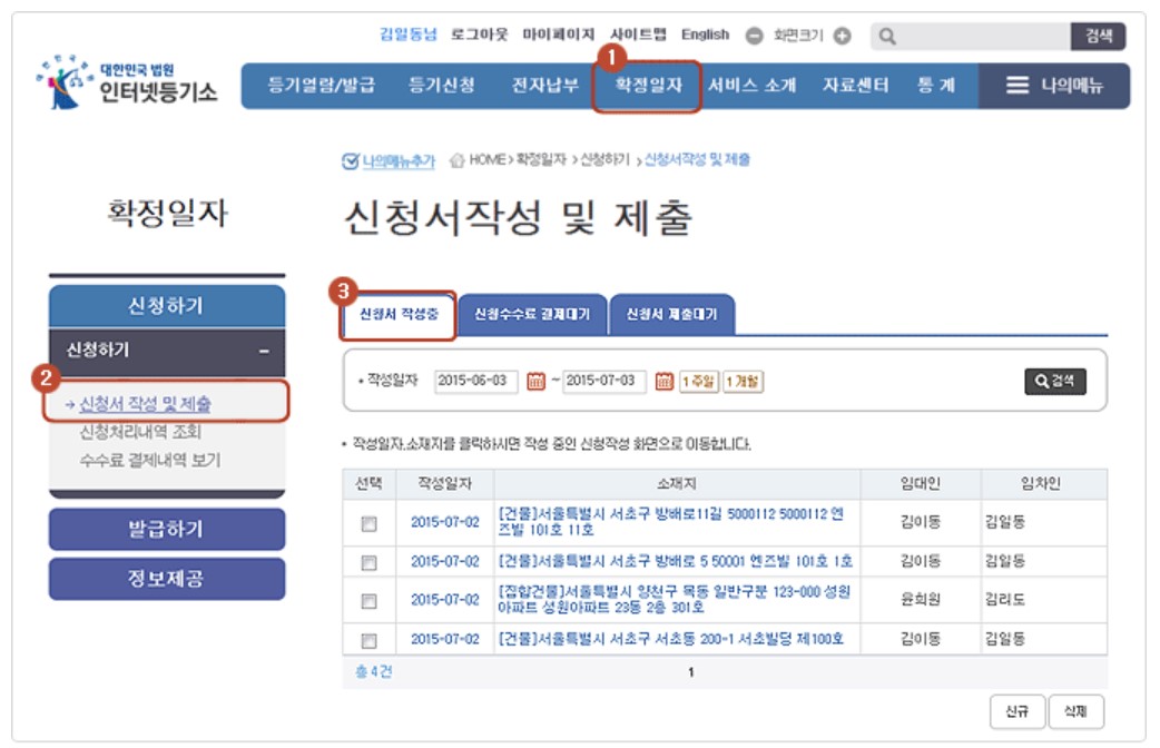 - 인터넷 등기소 > 확정일자 > 신청서 작성 및 제출 > 신청서 작성 중