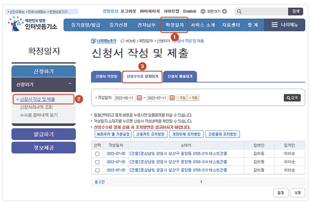 메인 화면의 확정일자 메뉴에서 신청서 작성 및 제출의 두 번째 탭인 신청수수료 결제대기를 선택합니다. 작성이 완료되었거나 결제 대기 중인 문서를 확인할 수 있습니다. 신청할 문서를 선택하신 후 하단의 결제 버튼을 클릭하시면 신용카드, 계좌이체, 휴대폰 결제 등의 방법을 선택해서 결제하실 수 있습니다.