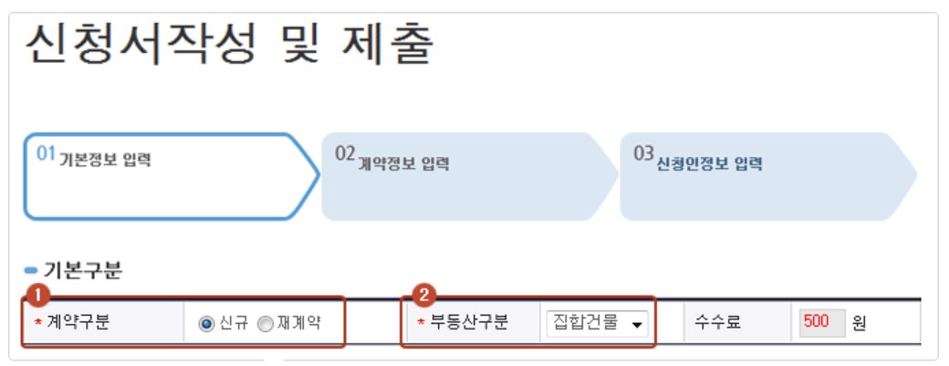 가장 먼저 계약 구분 메뉴가 있는데요, 신규 혹은 재계약 여부를 표시해 주세요. 부동산 구분은 아파트처럼 각 호별로 등기된 경우 집합건물로 표시합니다.