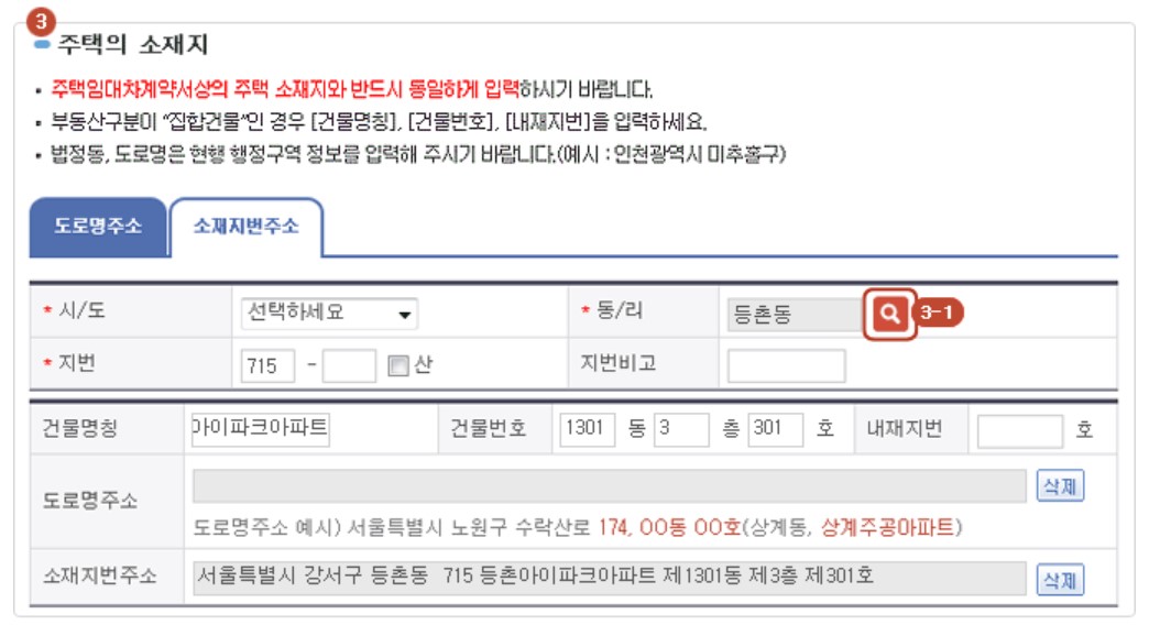 주택 소재지 정보를 입력해야 하는데요, 주택임대차 계약서 상의 소재지와 동일하게 입력하셔야 합니다. 건물 명칭, 번호, 법정동, 도로명 등 임대차 계약서 상에 도로명 주소와 소재지번 주소가 모두 있으면 모두 입력합니다.