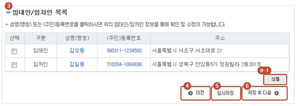 임대차계약증서의 기본 정보를 입력합니다. 주택 유형, 계약일, 면적, 임대차 기간 등을 계약서와 동일하게 작성합니다. 계약서 상에 기재된 임대인과 임차인의 이름과 주민등록번호, 주소, 휴대폰 번호 등을 정확하게 기입합니다. 임대인, 임차인 목록을 확인한 후 저장하면 신청인 정보 입력 화면으로 넘어갑니다.