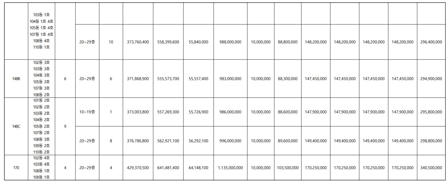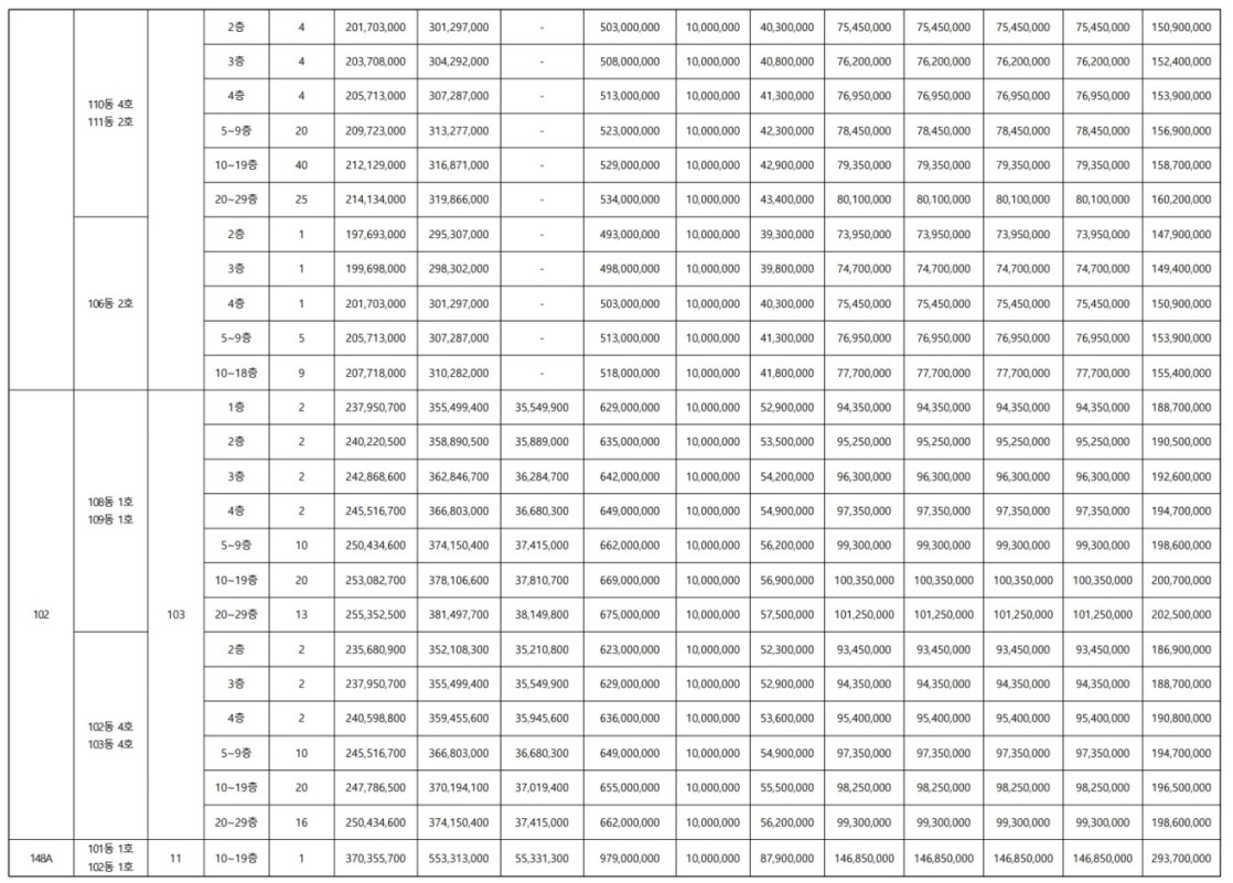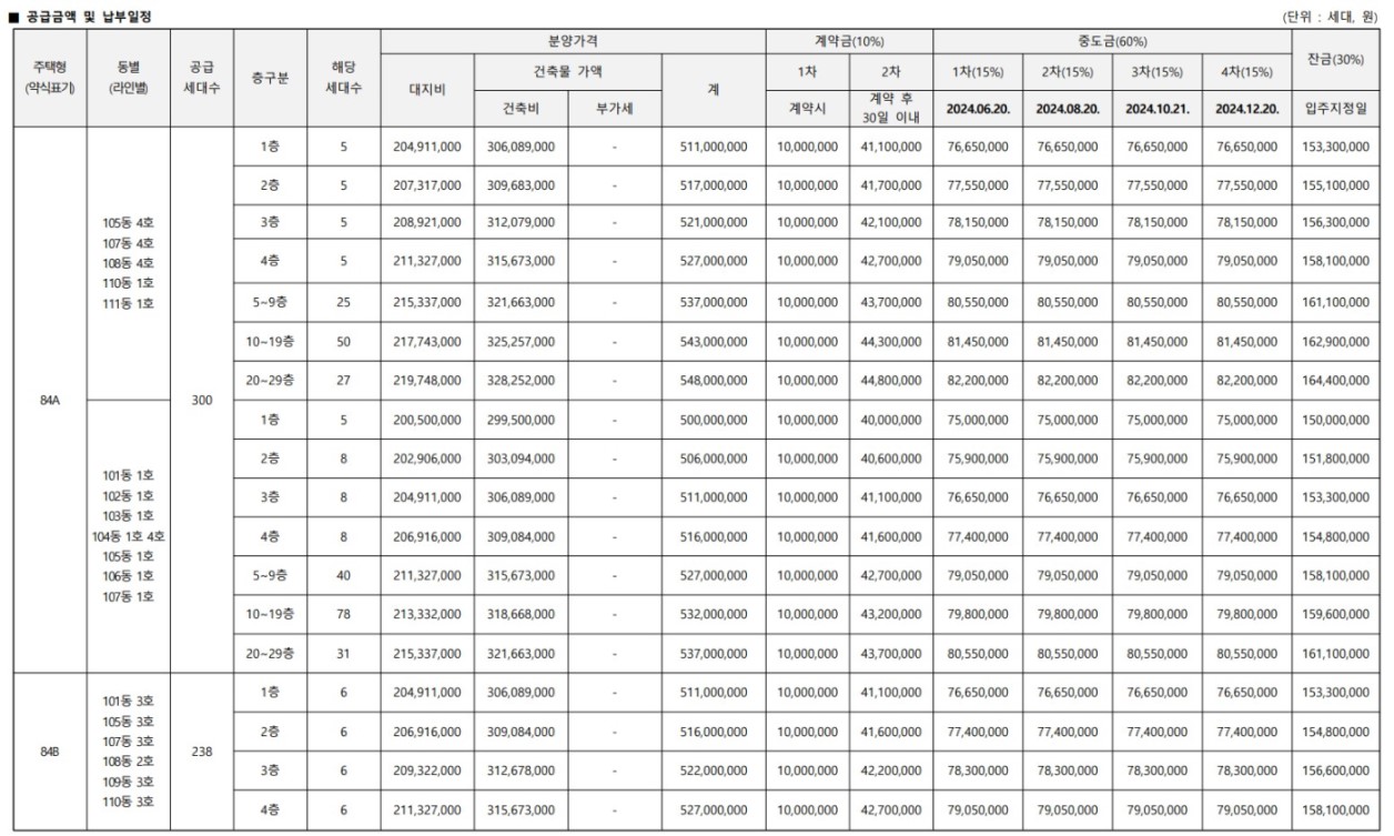 타입, 층별 자세한 공급가액은 아래의 표를 참조하세요.