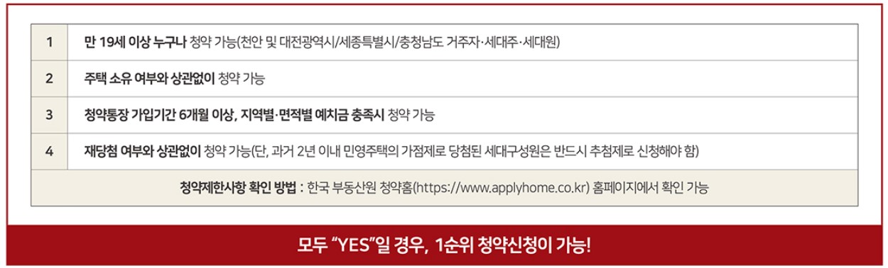 ● 만 19세 이상 누구나 청약가능(천안, 대전, 세종, 충남거주 세대주, 세대원)