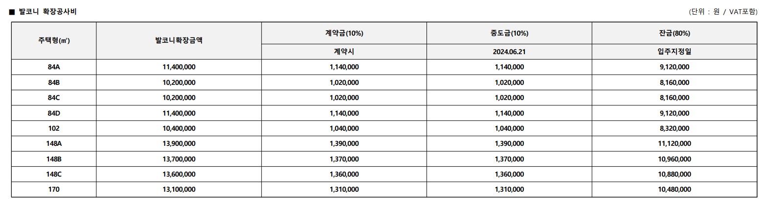 공급가는 발코니 확장 금액 불포함된 금액입니다. 평형별 발코니 확장 금액은 아래와 같습니다.