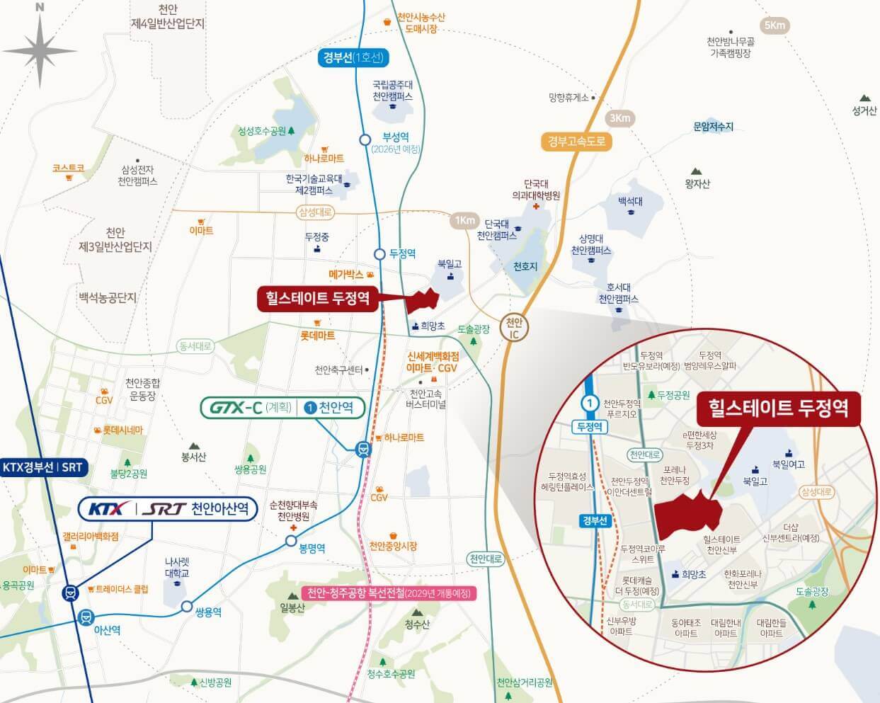 힐스테이트 두정역은 천안에서 신규 아파트가 많이 지어지고 있는 서북구에 자리하며, GTX 및 지하철 1호선, 경부선이 지나는 교통의 요지에 자리합니다. 서울과 수도권으로 빠르게 이동할 수 있는 곳으로 1호선 두정역, 경부고속도로 천안 IC, KTX 천안아산역, 천안-청주공항 간 복선 전철(2029년 개통예정) 등 광역 교통망이 잘 발달된 곳입니다.