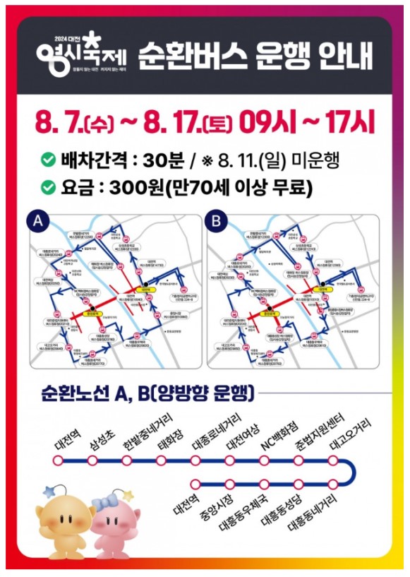 대전 0시 축제는 축제장 인근을 순회하는 순환버스를 운영합니다. 배차간격은 30분으로 300원의 이용료가 있으며 만 70세 이상은 무료 이용이 가능합니다. 8월 7일(수) ~ 17일(토)까지 운영합니다. 자세한 노선표를 확인하세요.