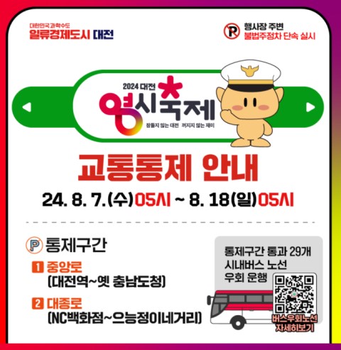 축제기간 동안 축제가 벌어지는 대전역 - 옛 충남도청 구간, 대종로 일대는 교통통제가 이루어집니다. 이 구간을 운행하는 시내버스도 우회 운행되니 지하철을 이용하시기 바랍니다. 행사 기간 중에는 원활한 축제 진행을 위해 주정차 단속이 엄격히 진행될 예정이니 자차 이용객은 인근의 주차장을 이용하시기 바랍니다.